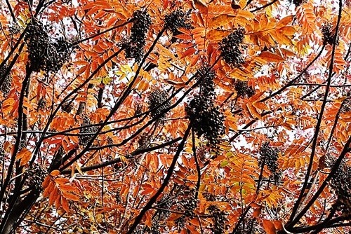 「ハゼノキ」であるが、黒い種の房がいっぱい下がっていた。