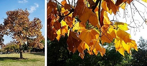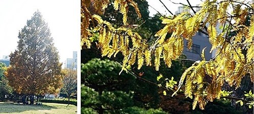 そこには大きなメタセコイアとプラタナスの大木が、1本づつだけ立っている。そろそろ黄葉が始まっていたが、メタセコイアは林になっていないと綺麗ではない。道路で区切られた反対側の公園にも行ってみたが、この公園は紅葉する木が少なかった。