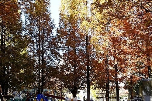 1ヵ所目は聖路加国際病院近くの「あかつき公園」にある、「メタセコイア」の秋である。メタセコイアは巨木で、中国中部が原産地である。