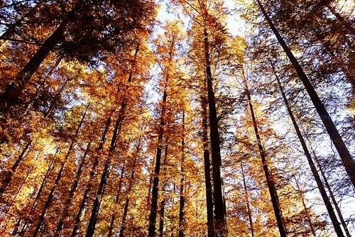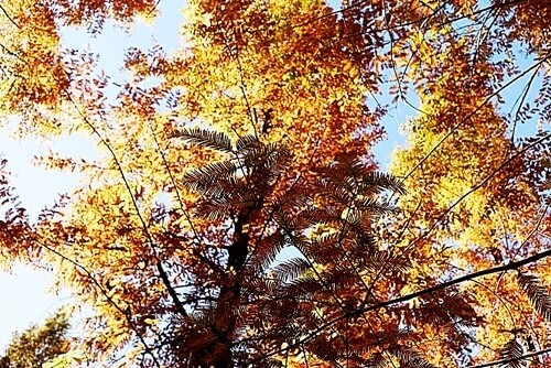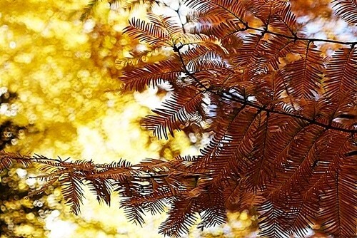 逆光の中でメタセコイアの葉が、金色に輝いて見える。