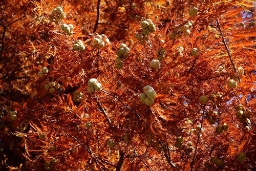 「メタセコイアの森」に向って歩いて行く途中にも、多くのメタセコイアが植えてある。理由は分からないが、その辺りのメタセコイアには大量の実が生っている。実の生っていない木もあり、その方が多いように感じた。