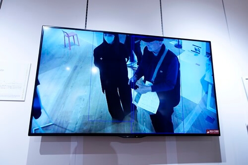 そして説明を始めた。『これは監視カメラの画像ですが、この模様のものを持つと、その人だけ感知されません』。なにもしないとカメラは人を認識して、その人を四角で囲む。