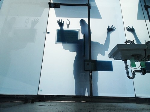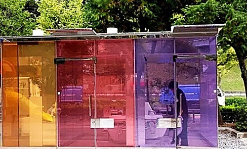 普段は個室の中が見える透明なトイレであるが、中に入り鍵を締めると不透明になるという非常にユニークな設計である。