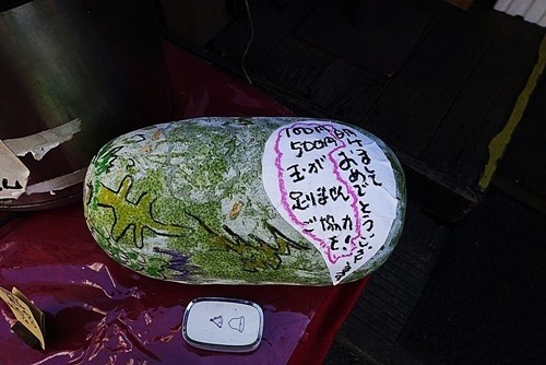 それは大きな細長い冬瓜に、「明けましておめでとう。100円、500円玉が足りません。ご協力を!」と書かれていた。以前にこの八百屋で初めて巨大な「晩白柚(ばんぺいゆ)」を買ったことがある。