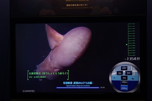 あまり入場者もいなかったし、私も退屈だから遊んでみた。「みなとエレベーター」という場所では、「港区の海」の画面で深海の深さを選ぶ。私は6500mを選んだら、目の前の画面に深海の生き物たちが現れた。