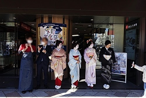 その隣では尺八と三味線の合奏をやっている。イベントの規模が小さく期待したほどでないので1階に下りると、入口で芸者衆が勢揃いで写真撮影に応じていた。