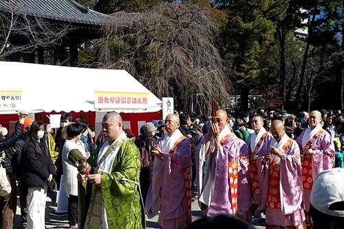 現地に着いたら、もう長い行列が出来ていた。最後尾に並ぶが、なかなか始まらない。梵鐘の音とともに大僧正に続き、年男・年女が進んで来た。