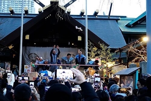 続いて舞台の上から山本中央区長、なんとか衆議院議員が短い挨拶をして、豆まきが行なわれた。ここでは舞台が狭いこともあり、年男・年女は登場しなかった。