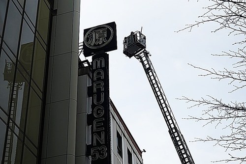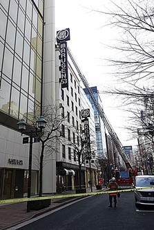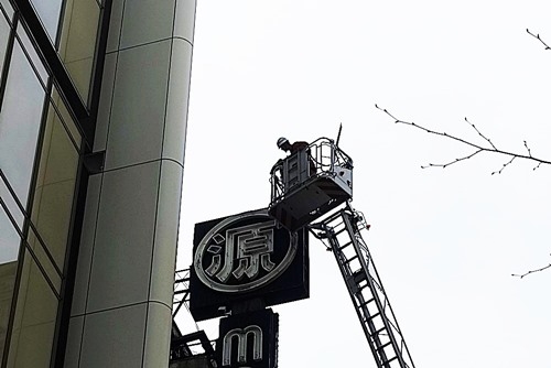 消防車の停まっている場所がノエビア銀座ギャラリーの前なので、通行止めで入れない。ハシゴが伸びていたので上の方を見たら、先端のボックスに消防士が乗っていた。そしてハシゴは「丸源ビル」の看板の方へ寄って行った。
