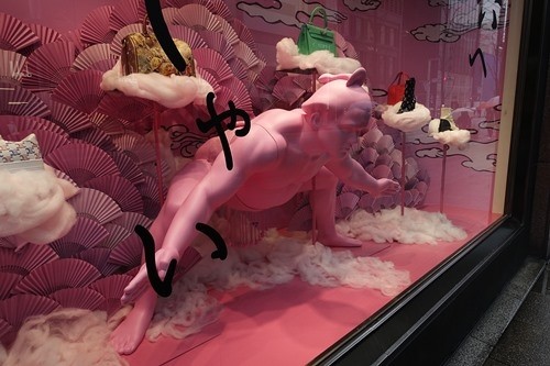 この場所は以前は、高級オーダー紳士服の「英国屋」だった。時代が変りIT関係が隆盛を誇り、社長がTシャツで現れるようになり、オーダー紳士服は銀座にいられなくなった。しかしショーウィンドーの、ピンクの力士は銀座ではどうなんだろう?