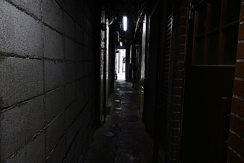 気を付けて見ると、小さな店と店の間に狭い暗い路地がある。