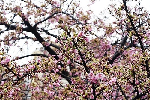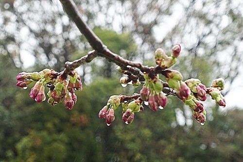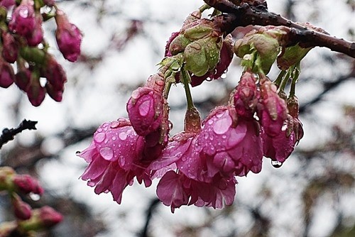雨の中で咲き出した河津桜(木場公園横)
