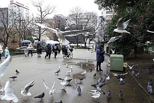 それに群がる「ゆりかもめ」と「野バト」が、争って餌を取る。