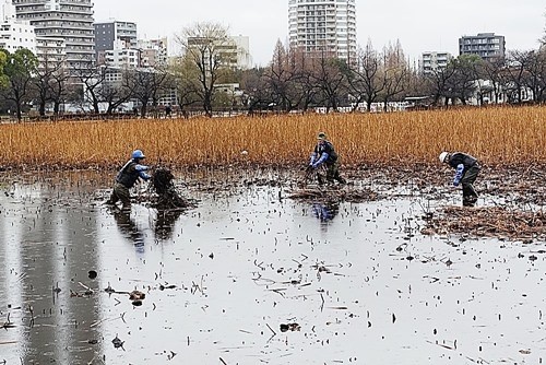 すると枯れた蓮の茎を集めて、取り除いているようだった。