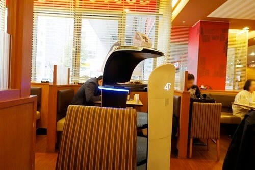 しばらくすると、配膳ロボットが席まで料理を運んで来る。自分で立ち上がって、料理と伝票を取る。そしてボタンを押して、ロボットを戻す。