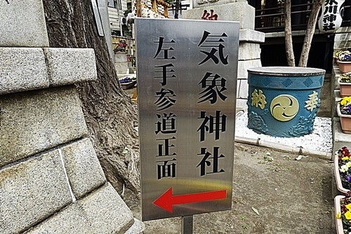 出口に向かったら、右手に大きな「気象神社 左手参道正面」の看板があった。