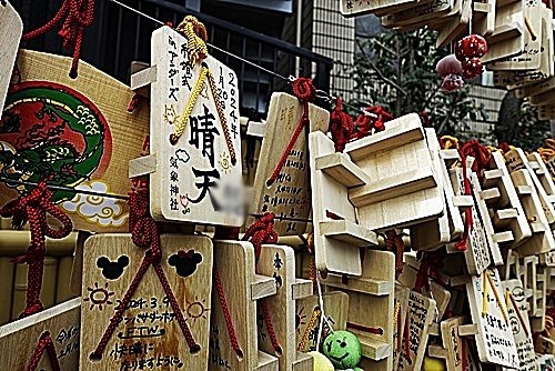 私も子供の頃に、やった覚えがある。下駄が上向きなら「晴れ」、裏返しなら「雨」、横向なら「雪」だった。絵馬には男女の名前と結婚式場が書かれている。とても微笑ましい。