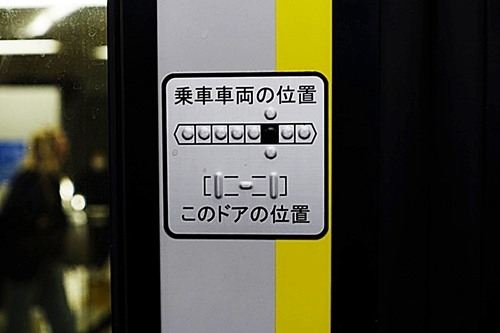 最近になって気が付いたのだが、ドアに向かって立っていたら、目の前に初めて見るプレートがあった。そこには「乗車車両の位置」と「このドアの位置」が示されていた。今までは空いた席に座ろうと考えていたので、こんな表示があるとは知らなかった。