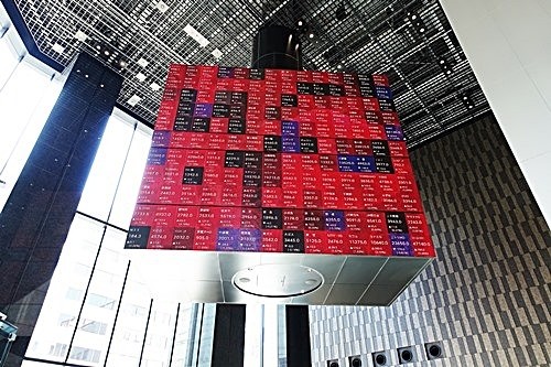 友人達は現役の時は上場企業で働いていたので、いまでも売買はしないが、株式を持っているからカブトワンには興味があるようだ。カブトワンに入ると1階ロビーの天井から吊り下げられた、巨大な回転する大型LEDディスプレエイが目に入る。ディスプレイはリアルタイムで株価を映し出す。値上りは「赤」、値下りは「青」で表示される。画面の数字が目まぐるしく変化する。