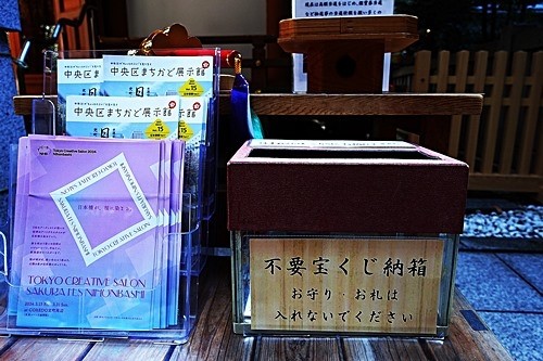 待合わせ時間より早くみんなが集まったので、予約が取れなかった「伊勢定」の前を通り、福徳神社に向かった。神社の賽銭箱の横に「三方」が置いてあり、2人の若い女性が宝くじを置いて、「当たりますように」と念じて金色の鈴を鳴らしていた。