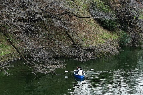 千鳥ヶ淵のお濠を見たら、ボートが1艘だけ花の無い木の下に出ていた。
