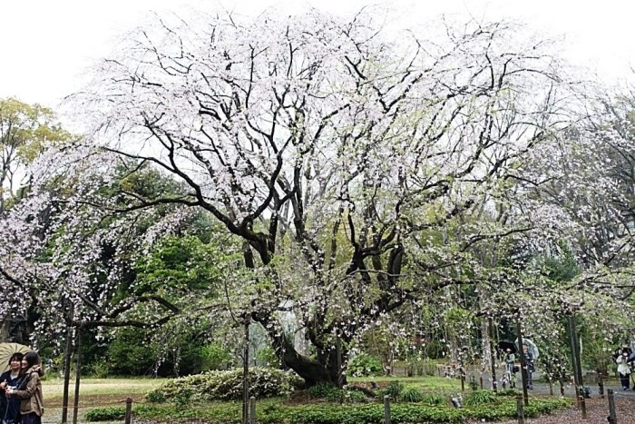 シニア料金の150円を払って中に入ると内庭大門があり、そこから有名な枝垂れ桜が見る。大勢の人達が枝垂れ桜の前で、記念写真を撮っている。