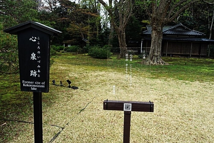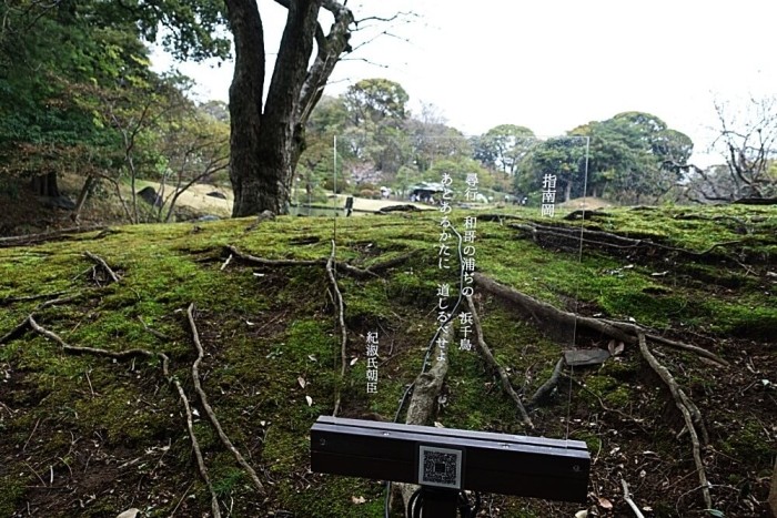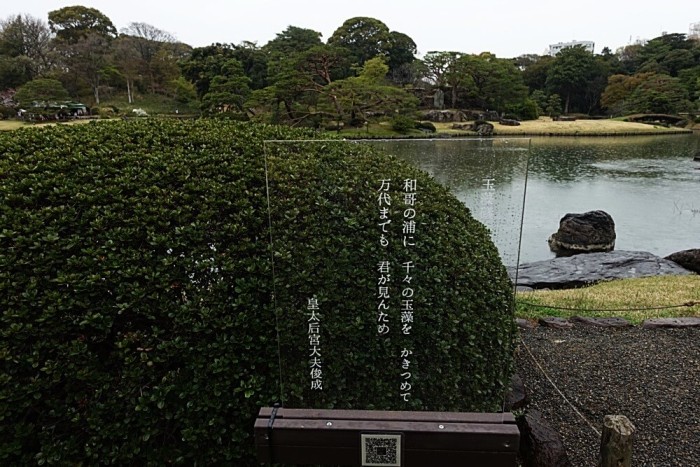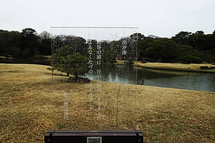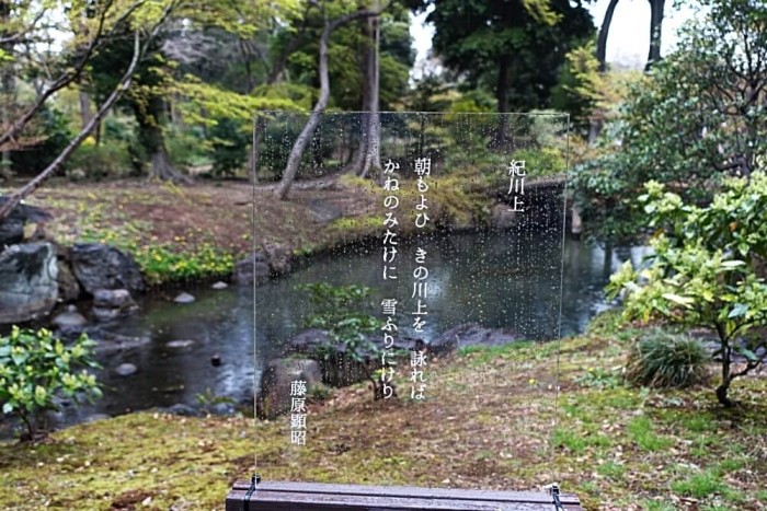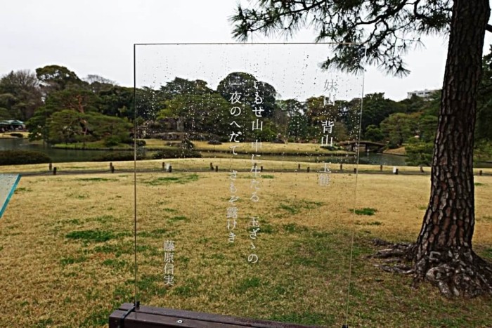 庭園内のところどころにアクリル板が立ててあり、そこには風景に合わせた和歌が書かれている。アクリル板の和歌を通して庭を見るという、粋な計らいである。
