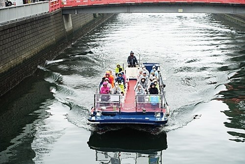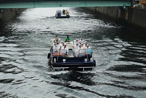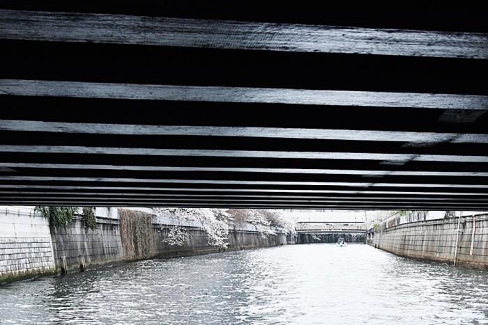 6人が先頭の座席の横一列に並んで座った。定員の40人が揃い、定刻に船は出発した。水門を通り過ぎて、いよいよ目黒川に入った。