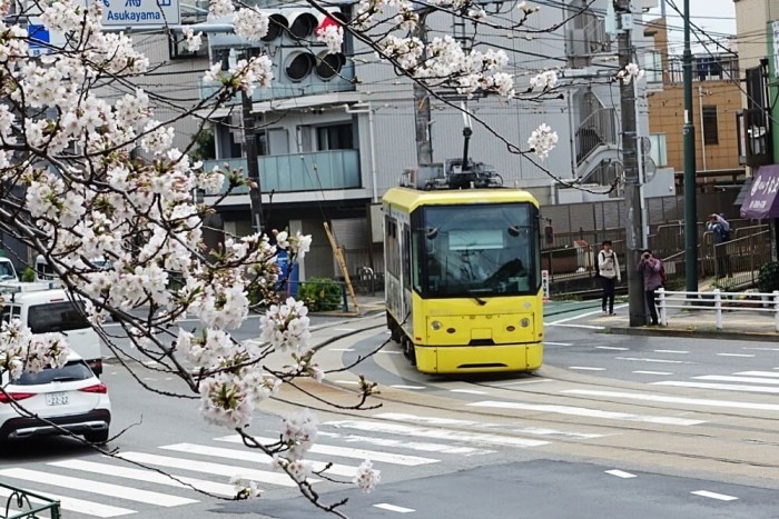 次に横断歩道橋を渡り下に降り、そこから桜越しに都電を撮る。