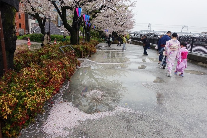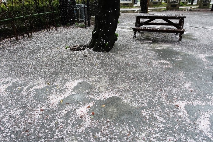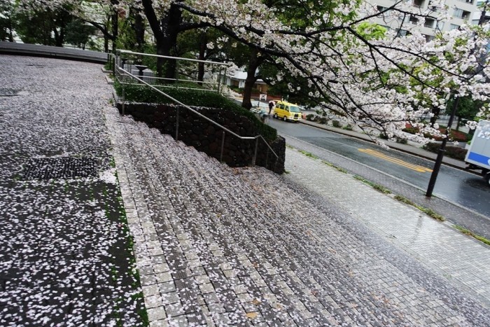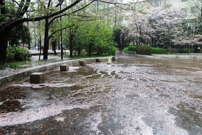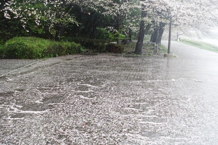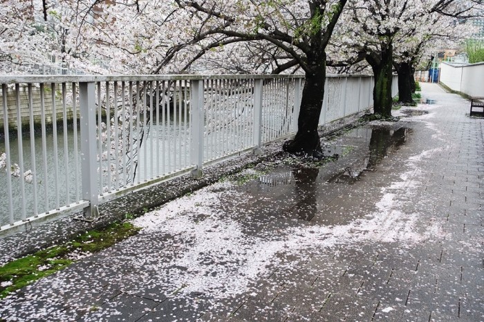 ところどころの水たまりに花びらが溜り、小さな花筏を作っていた。