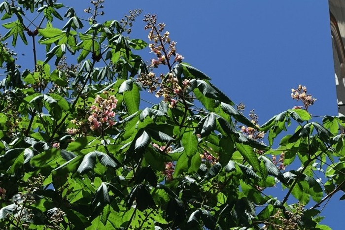 この道は「マロニエ通り」と名付けられているが、その名の通り道路の両側にマロニエが植えられている。いまは花の茎が延び、蕾が見える。間もなく赤い花が咲くだろう。秋には枝落しをしないで、実をならせて欲しい。マロニエの実は栗に似ている。