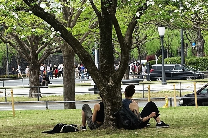 皇居前公園で休む若い刺青の外国人女性2人。