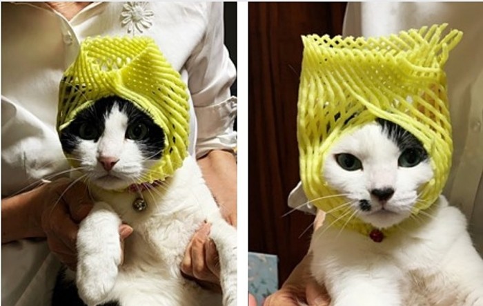 ペッパーとポアンである。ある時、オレンジを買って来た時に、保護用のプラスチック網で猫の帽子を作ろうと考えた。きっとい2匹が喜ぶだろうと、私が勝手に思ったのである。