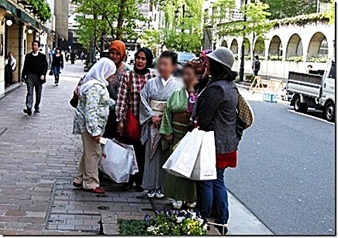 和服のオバサンをつかまえて、記念撮影をせがむインドネシア人観光客。