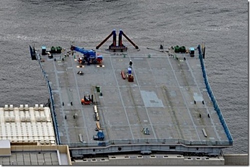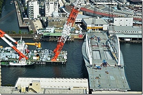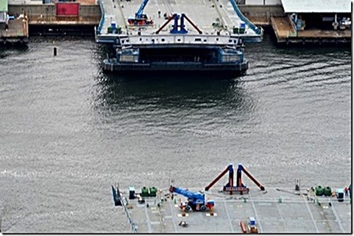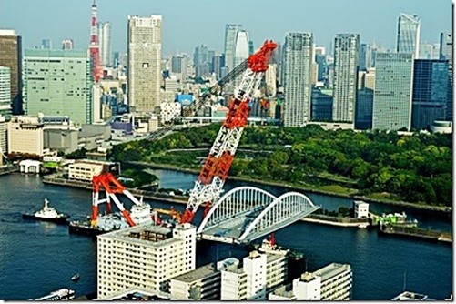 最近は現場でコンクリートを流し込むのではなく、工場で作った長さ150メートルくらいの橋を船で運んで来る。