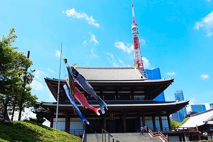 帰りは浜松町駅に出て、大江戸線で戻ろうと考えた。そして駅まで歩いていて、芝・増上寺の境内を通った。すると本殿に向って左側に、大きな「鯉のぼり」が泳いでいた。