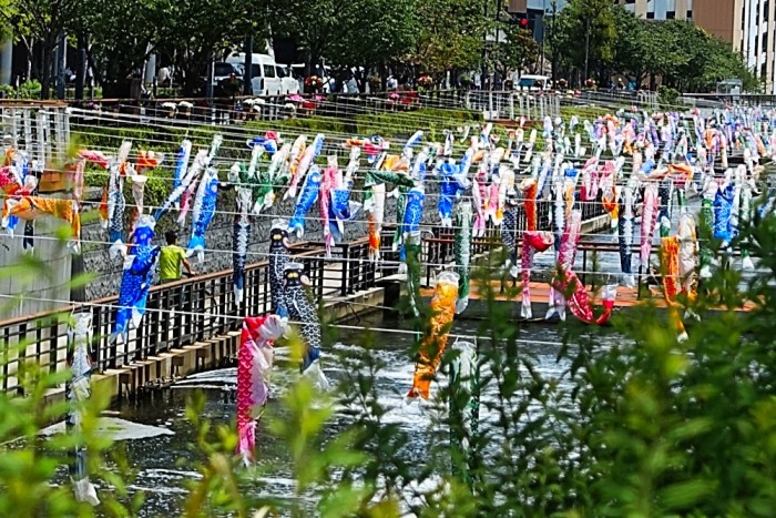 大量の「鯉のぼり」が川の上で泳ぐ。
