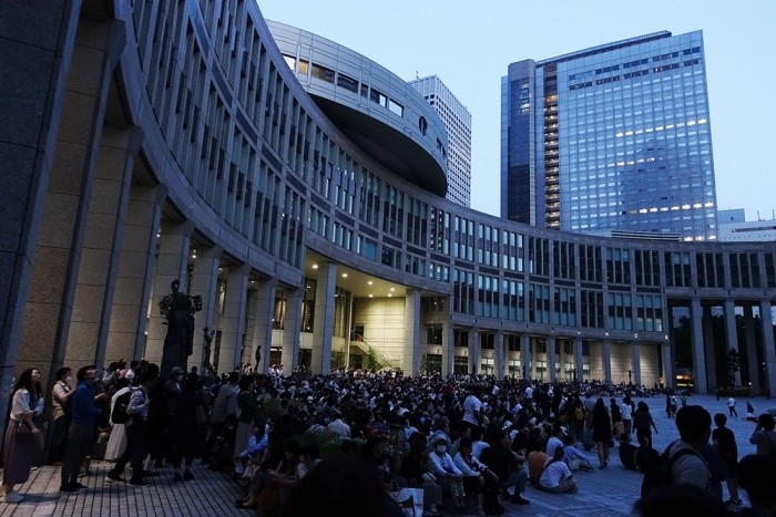 午後6時30分頃に都庁1階の広場に向かうと、既に広場を埋める観客がいた。