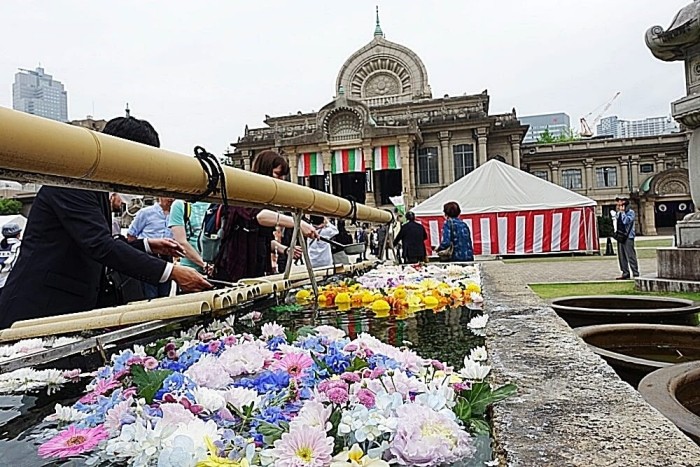 これは花手水で、お寺や神社が春先に行うことが多い。このような日本文化は、いつまでも残って欲しいと願っている。