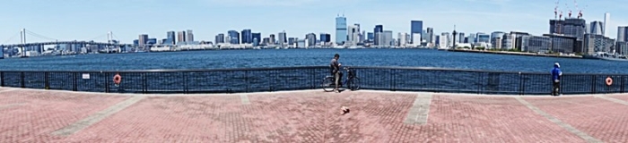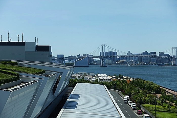 反対側に行くと、正面に元選手村の「HARUMI FLAG」、右下に晴海大橋、左手にがレインボーブリッジが見える。なかなか良い見晴らしである。