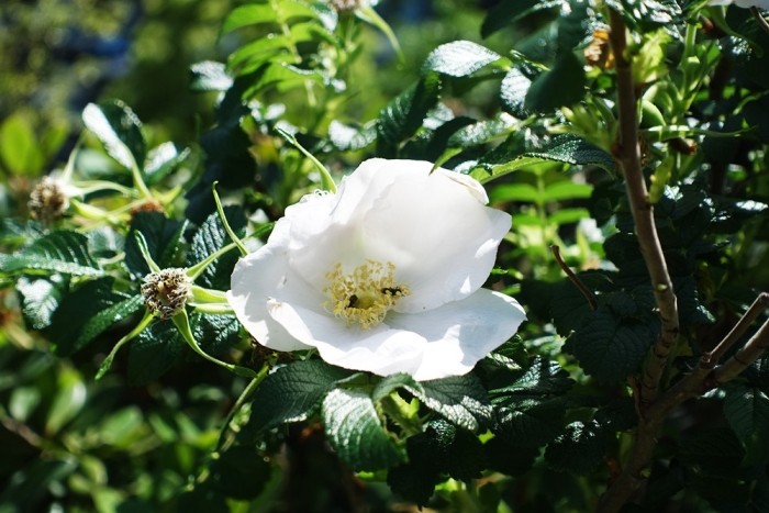 途中の月島警察署の裏に行ってみたら、今年も「ハマナス」の花が咲いていた。