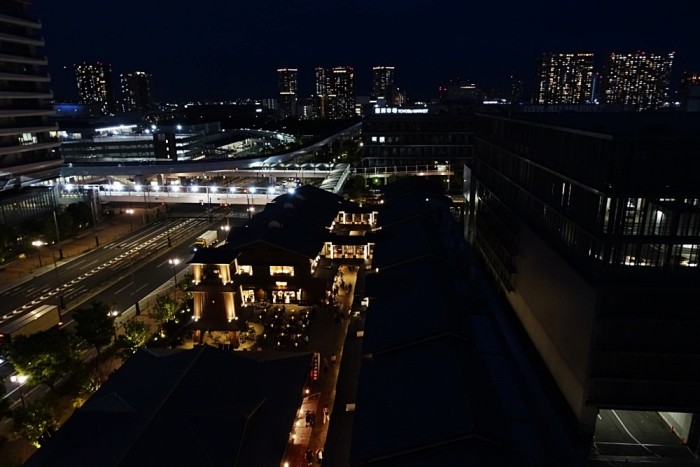 窓から見下ろすと、千客万来、豊洲市場、その奥に有明のタワーマンションが見える。