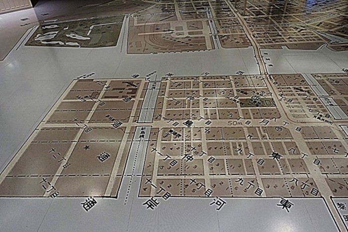 吉原の話や、新橋芸者の話など、とても面白かった。1階の奥に江戸時代の展示がある。その場所の床には、江戸時代の古地図が書かれている。