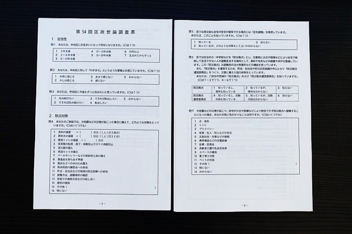 今回は第54回で調査項目は「防災・健康診査・高齢者施策・子育て支援・男女共同参画社会・防災対策・スポーツ・地域コミュニティ・築地市場・受動喫煙防止対策・デジタル技術を活用した区民サービス・広報・環境・伝統文化・施策の要望と評価」と幅広い質問であった。