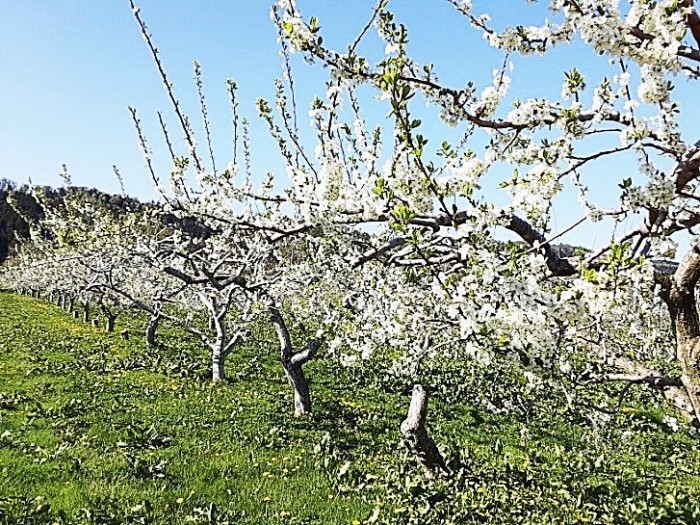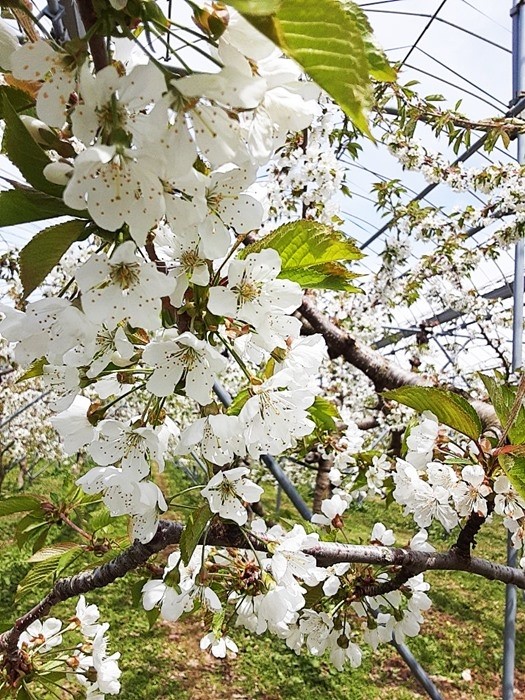 『さくらんぼの花が満開です。マメコバチの巣と、ハチの大きくなったものも写ってます』とあり、2回に分けて多数の写真が添付してあった。