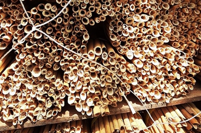 『アシに産み付けられた卵の入った筒状のものは、束ねて保管しておく。そして繭を取り出して冷蔵庫に入れる。春に生まれて来たマメコバチは天敵に食われ数が減るので、不足分を青森から買う。マメコバチの行動範囲は50~60メートルと狭いので、遠くの果樹園農家に飛んで行ってしまうことは無い』
