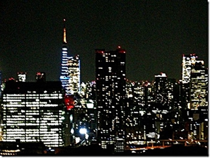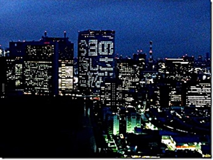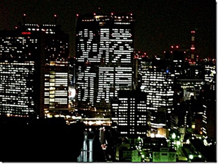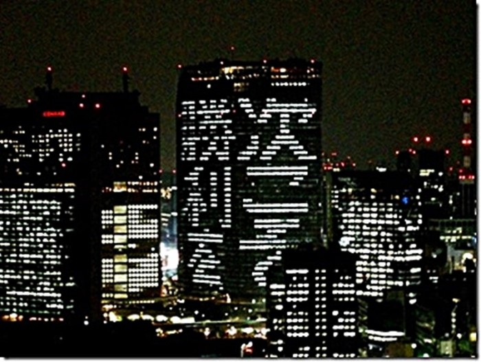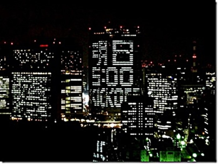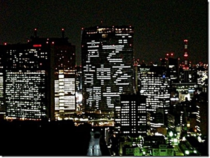 我が家から見える電通本社ビルは、窓の明かりで応援している。