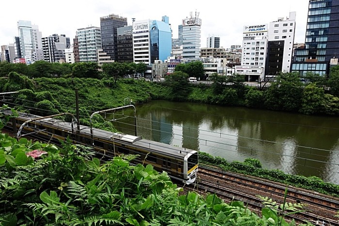 目の前をJR中央線、総武線が行き交っている。この映像は電車からも見える。