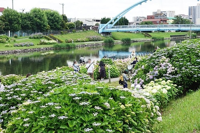 この水辺公園は旧中川に沿って歩道がある。歩道の横がアジサイの群生である。