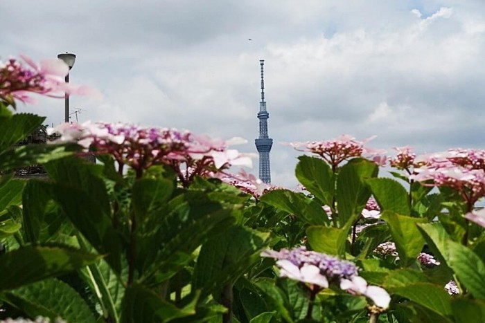 アジサイ「セイヨウ」の後方に東京ビッグサイトが見える。
